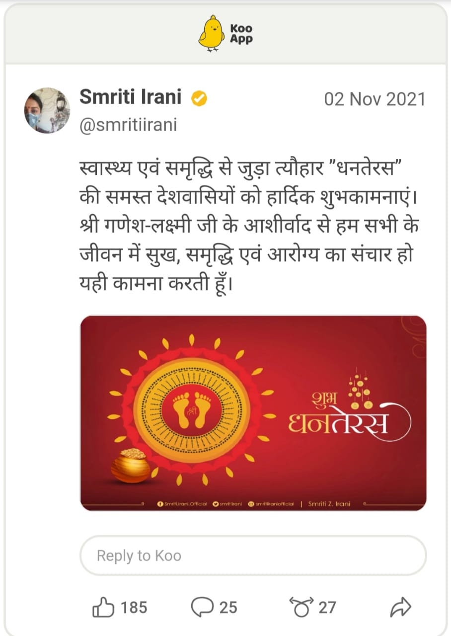 धनतेरस के इस मौके पाए कई राजनैतिक हस्तियों ने अपनी शुभकामनाएं देशवासियों को दी और अपने राज्य देश और दुनिया की सुख समृद्धि की कामना की। इसी कड़ी में सोशल मीडिया ऐप Koo के माध्यम से धनतेरस की शुभकामनाएं प्रेषित करने में लोकसभा अध्क्षय ओम बिरला, केंद्रीय मंत्री गिरिराज Smriti Irani